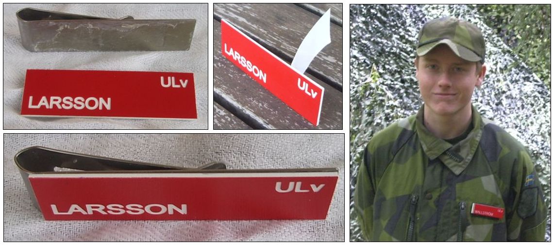 Namnbricka - monteringsanvisning Metallklämmans "böj" (vikning, mellan fram- och baksidan) ska vara till vänster när namnbrickan ses framifrån. Plastbrickan är självhäftande. Se bilder nedan.